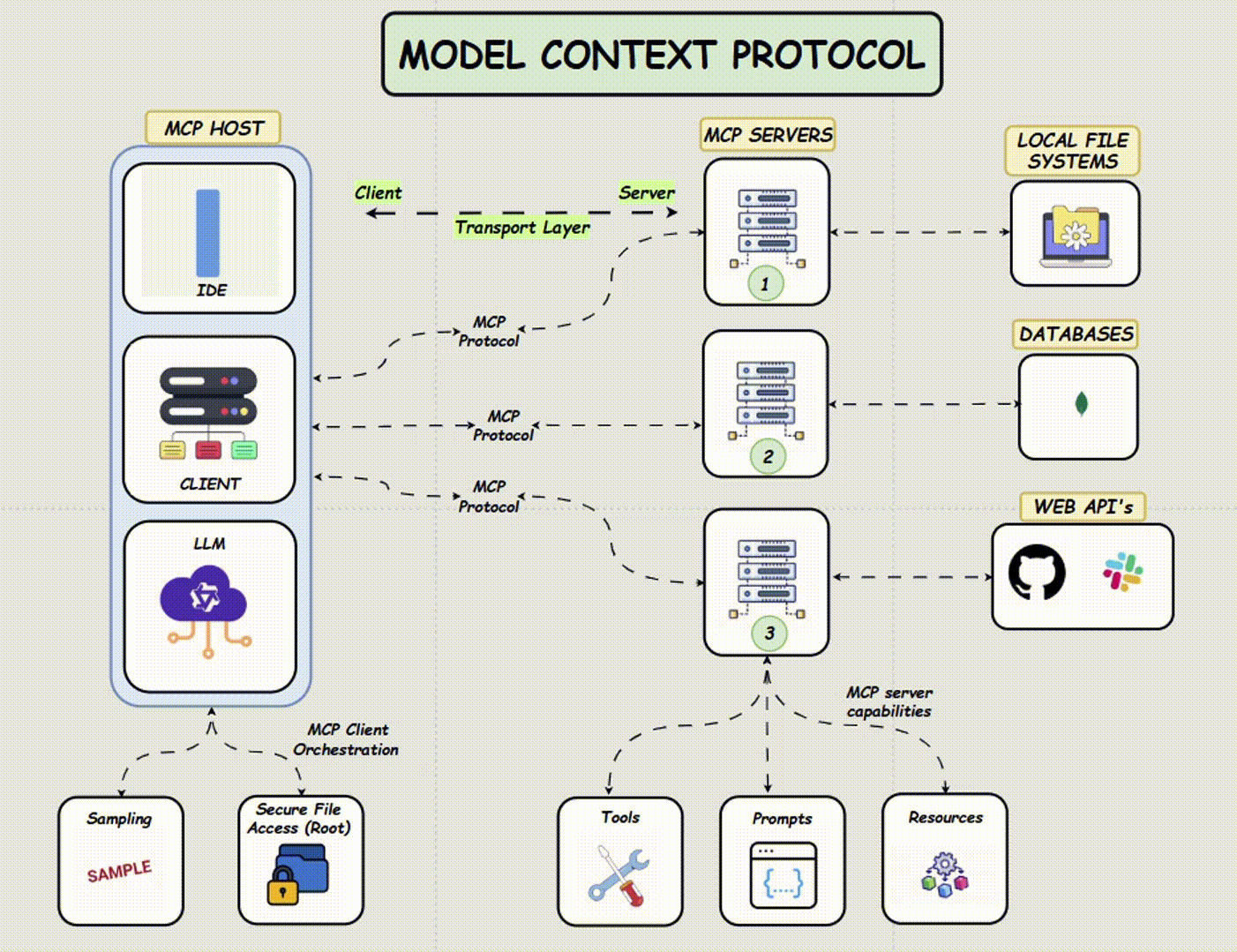 | Prompts | Người dùng | Các mẫu hướng dẫn được xây dựng sẵn hướng dẫn LLM sử dụng các công cụ và tài nguyên cụ thể |